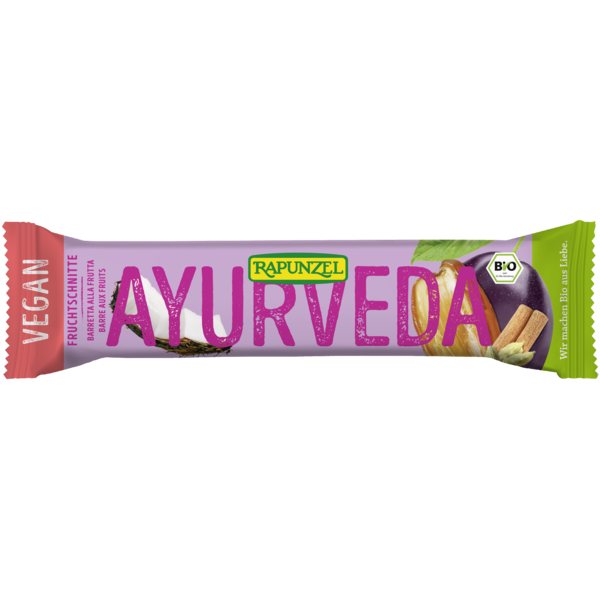 Les fruits séchés au soleil et les épices ayurvédiques sont les ingrédients de base de cette délicieuse barre fruitée. Indépendamment du dasha dominant (les énergies vitales Vata, Pitta ou Kapha), chaque repas ayurvédique doit si possible contenir toutes les saveurs, le sucré, l'acide, le salé, le piquant, l'amer et l'astringent. Les ingrédients de cette barre fruitée ont été sélectionnés en conséquence: les noix de coco râpées parfumées, les prunes fruitées et les épices ayurvédiques soigneusement choisies comme le gingembre, la cannelle, la cardamome, le curcuma, le poivre noir stimulent tous les sens du goût. Grâce au papier azyme si pratique, les doigts restent propres même en déplacement.