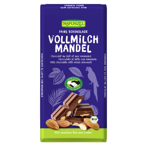 Ce chocolat au lait fondant avec des amandes croquantes est issu du programme HAND IN HAND de Rapunzel qui allie écologie et commerce équitable. Avec les matières premières de qualité, le conchage intensif est le véritable secret de ce délicieux chocolat. Grâce au conchage, les riches arômes cacaotés se libèrent petit à petit jusqu'à leur plein épanouissement. Et toute la subtilité et le fondant incomparable du chocolat se dévoilent.