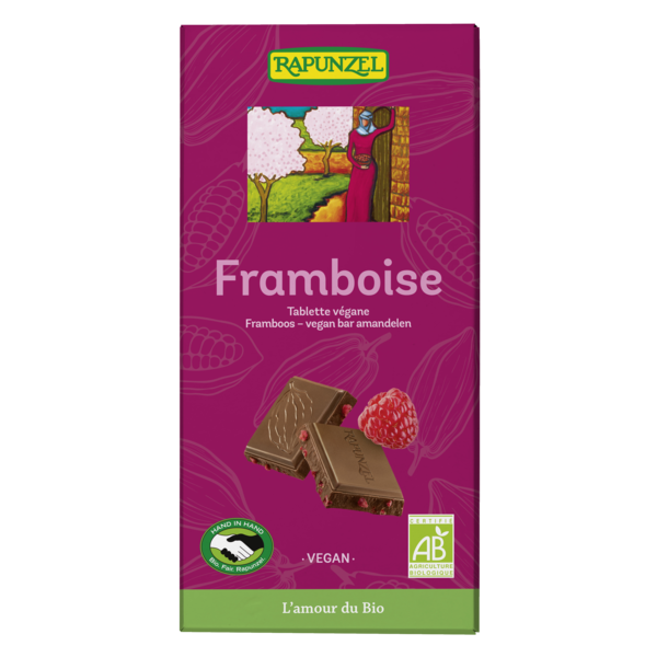 La tablette végane Framboise-Amande fait penser à un chocolat au lait fondant parsemé de petits morceaux de framboises. Son goût délicieusement fruité et légèrement acidulé de framboises va surprendre les papilles. La poudre d'amandes finement moulues constitue la base végane de cette tablette. Le chocolat Rapunzel est synonyme de grande qualité dans le respect de la fabrication traditionnelle suisse associée à de précieux ingrédients issus de l'agriculture biologique et du commerce équitable. Avec les matières premières de qualité, le conchage intensif est le véritable secret de ce délicieux chocolat. Grâce au conchage, les riches arômes cacaotés se libèrent petit à petit jusqu'à leur plein épanouissement. Et toute la subtilité et le fondant incomparable du chocolat se dévoilent.