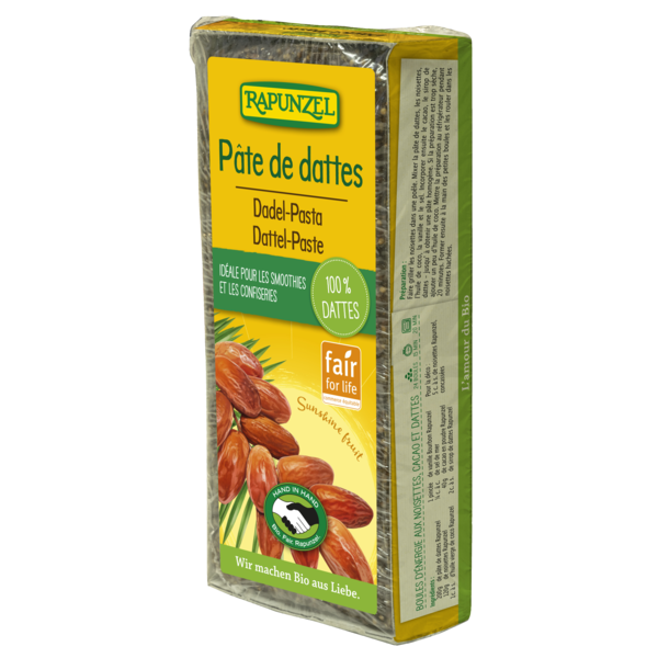 Une savoureuse pâte de dattes séchées au délicieux goût de caramel. Les dattes sont issues du commerce équitable contrôlé selon le référentiel Fair for Life et proviennent de notre partenaire HAND IN HAND en Tunisie. Cette pâte de fruits est idéale car prête à l'emploi et facile à portionner.