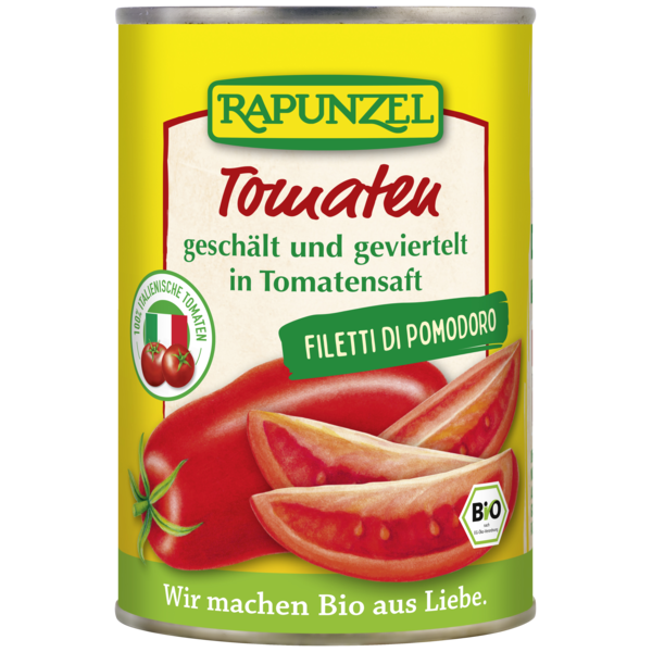 Goût très fruité. Les tomates italiennes mûries au soleil sont pelées, coupées en quatre et conservées dans un délicieux jus de tomates. Leur goût est particulièrement fruité et aromatique. En Italie, ces délicieux filets de tomates sont connus sous le nom de Filetti di Pomodoro et sont très appréciés. Ces morceaux de tomates sont prêts à l'emploi, il suffit de les réchauffer rapidement.
